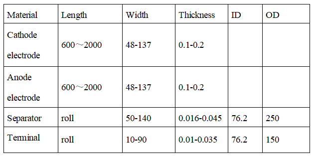 1. Ancho del separador : 50-140 mm. Especificación de la aguja de bobinado : ∮3,0-∮12 mm . Personalizar según los requisitos del cliente. Ancho del electrodo : 48-137 mm.