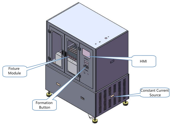 Cuenta con: control de temperatura independiente para cada capa de la placa, control de presión, funciones de carga/descarga, protección contra sobrecarga/descarga, contacto confiable entre las pestañas de la batería y los puntos de contacto, conectividad de datos, almacenamiento de datos una vez finalizado el proceso, clasificación de voltaje después de la carga, clasificación de capacidad después de la descarga y sistema de alarma de humo.