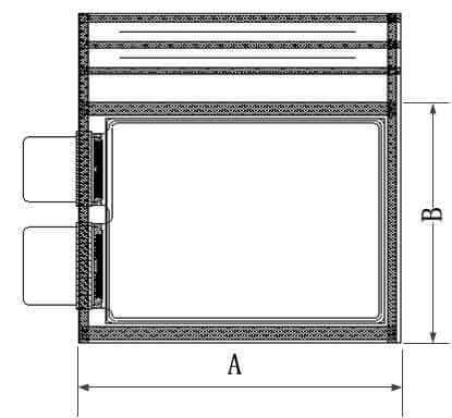 | A(mm) | B(mm) | Espesor de la celda (mm) | Longitud de la pestaña (milímetros) | Ancho de pestaña (milímetros) | Distancia de la pestaña (milímetros) | Ancho del airbag | Ancho de sellado lateral |