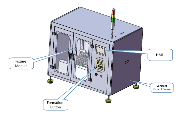 Cuenta con: control de temperatura independiente para cada capa de la placa, control de presión, funciones de carga/descarga, protección contra sobrecarga/descarga, contacto confiable entre las pestañas de la batería y los puntos de contacto, conectividad de datos, almacenamiento de datos una vez finalizado el proceso, clasificación de voltaje después de la carga, clasificación de capacidad después de la descarga y sistema de alarma de humo.