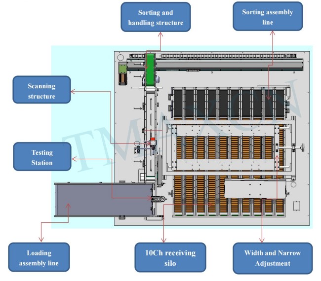 La clasificadora cuadrada de diez niveles consta de un mecanismo de alimentación, un mecanismo de prueba, un mecanismo de escaneo, un mecanismo automático de clasificación y recepción, etc. En primer lugar, la batería completa se coloca manualmente en la línea de ensamblaje de alimentación, que las envía una a una al área de prueba para la verificación de datos. A continuación, las baterías se escanean y se vinculan al código QR en el área de escaneo, y los datos de prueba se vinculan al código QR. Una vez finalizado el escaneo, la clasificadora utiliza un brazo mecánico para introducir celdas de diferentes voltajes en la línea de ensamblaje de clasificación y fluirlas al contenedor de recepción del nivel correspondiente. Este ciclo de trabajo continúa.