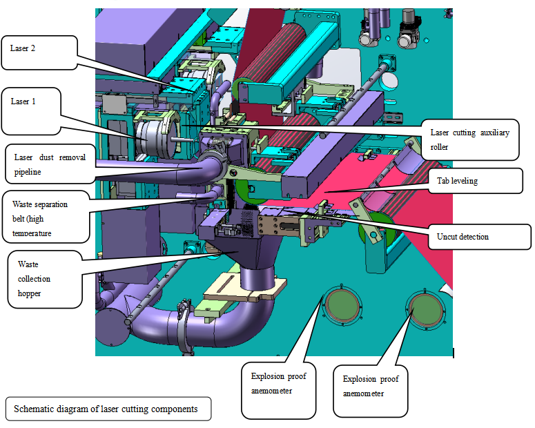 放卷机构: Mecanismo de desenrollado --放卷纠偏:Corrección de desenrollado:--接带平台:Plataforma de adquisición--放卷张力:Tensión de desenrollado--过程纠偏:Corrección del proceso--激光切割:Láser corte--牵引机构: Mecanismo de tracción--极耳除尘: Eliminación de polvo de lengüeta--张力机构: Mecanismo de tensión --储片机构: Mecanismo de almacenamiento de película--瑕疵检测: Detección de defectos-- V角裁切: Ángulo en V corte--拉切机构: Mecanismo de corte--尺寸检测: Inspección dimensional--上刷粉: Polvo del cepillo superior--下刷粉: Polvo del cepillo inferior-- NG收料: Recepción NG-- OK 收料: Recepción OK