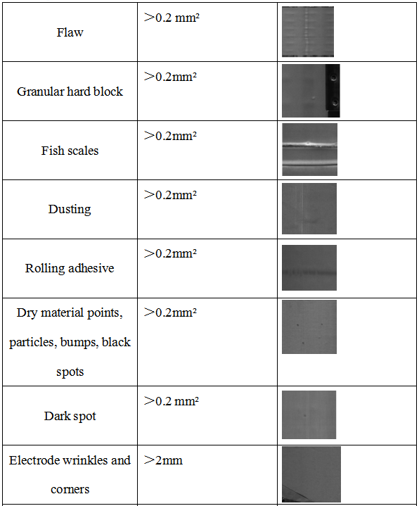 Cuando el electrodo pasa por el rodillo, una cámara de matriz lineal escanea la superficie del electrodo fila por fila y la concatena para obtener una imagen completa. Un algoritmo específico de detección de imágenes analiza y calcula las características de la imagen. Con base en los indicadores predefinidos de cada parámetro de defecto, el software emite una señal de aprobado/rechazado, y el electrodo defectuoso es eliminado automáticamente por el mecanismo de eliminación de producto defectuoso .