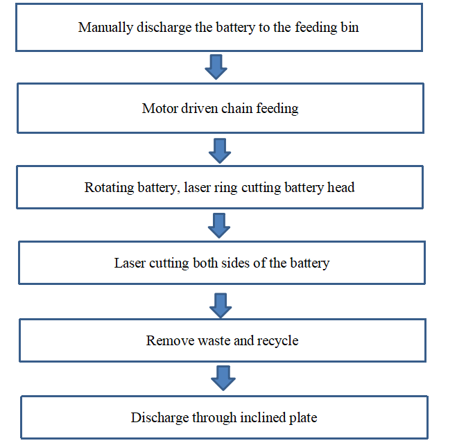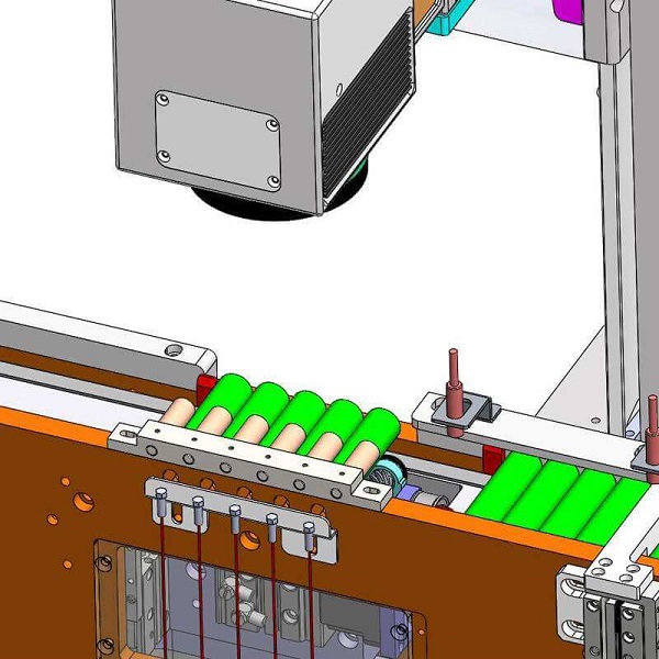 El rayo láser centra las cinco baterías en dos líneas rectas, y los dos rieles de la cadena están dispuestos uno junto al otro. El rayo láser corta la cabeza y ambos lados simultáneamente.