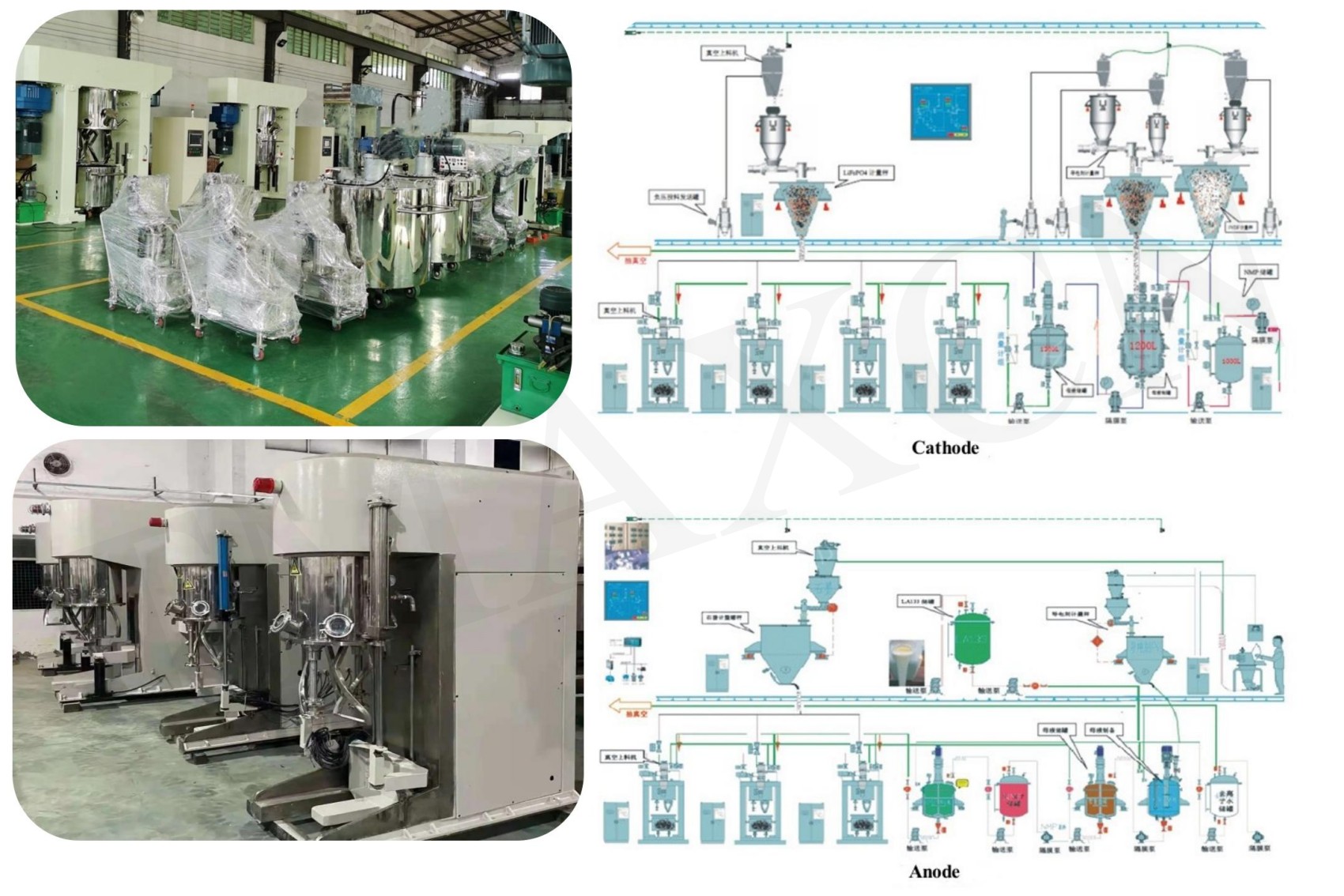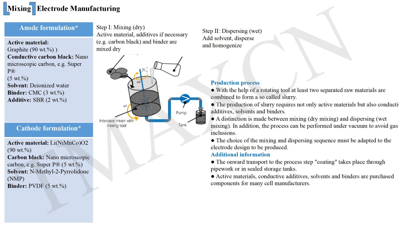 Para producir una suspensión de electrodos, las materias primas activas se combinan con disolvente, aglutinante y aditivos. La mezcla de la suspensión es el primer paso del proceso de fabricación de electrodos y se realiza por separado para los materiales del cátodo y del ánodo. Las características medibles clave de este proceso (viscosidad, densidad, contenido de sólidos) afectan directamente la calidad de la batería y la uniformidad del electrodo. En el proceso de mezcla, la formulación de las materias primas, los pasos de mezcla y el tiempo de mezcla son parámetros importantes.