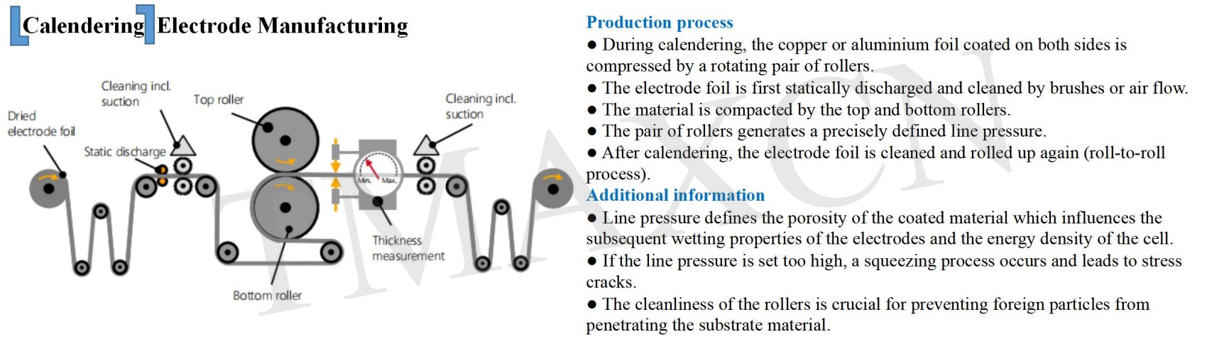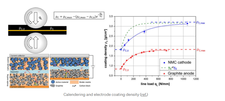 El calandrado es un proceso importante que afecta el rendimiento de la celda al controlar la porosidad y la tortuosidad del electrodo. Una mayor presión de calandrado aplicada al electrodo reduce el grosor de la capa activa, lo que aumenta la densidad energética volumétrica. Por otro lado, un calandrado fuerte también aumenta la tortuosidad del electrodo, lo que afecta su impedancia electroquímica.