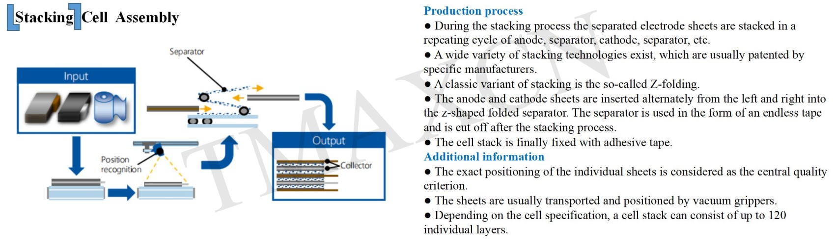 Las celdas prismáticas se utilizan a menudo en baterías de alta capacidad para optimizar el espacio. Estos diseños emplean una estructura de electrodos apilados, en la que las láminas del ánodo y el cátodo se cortan en placas individuales, apiladas alternativamente y separadas por un separador. Este separador puede cortarse al mismo tamaño que los electrodos, pero es más probable que se aplique en una tira larga enrollada en zigzag entre electrodos alternados en la pila.