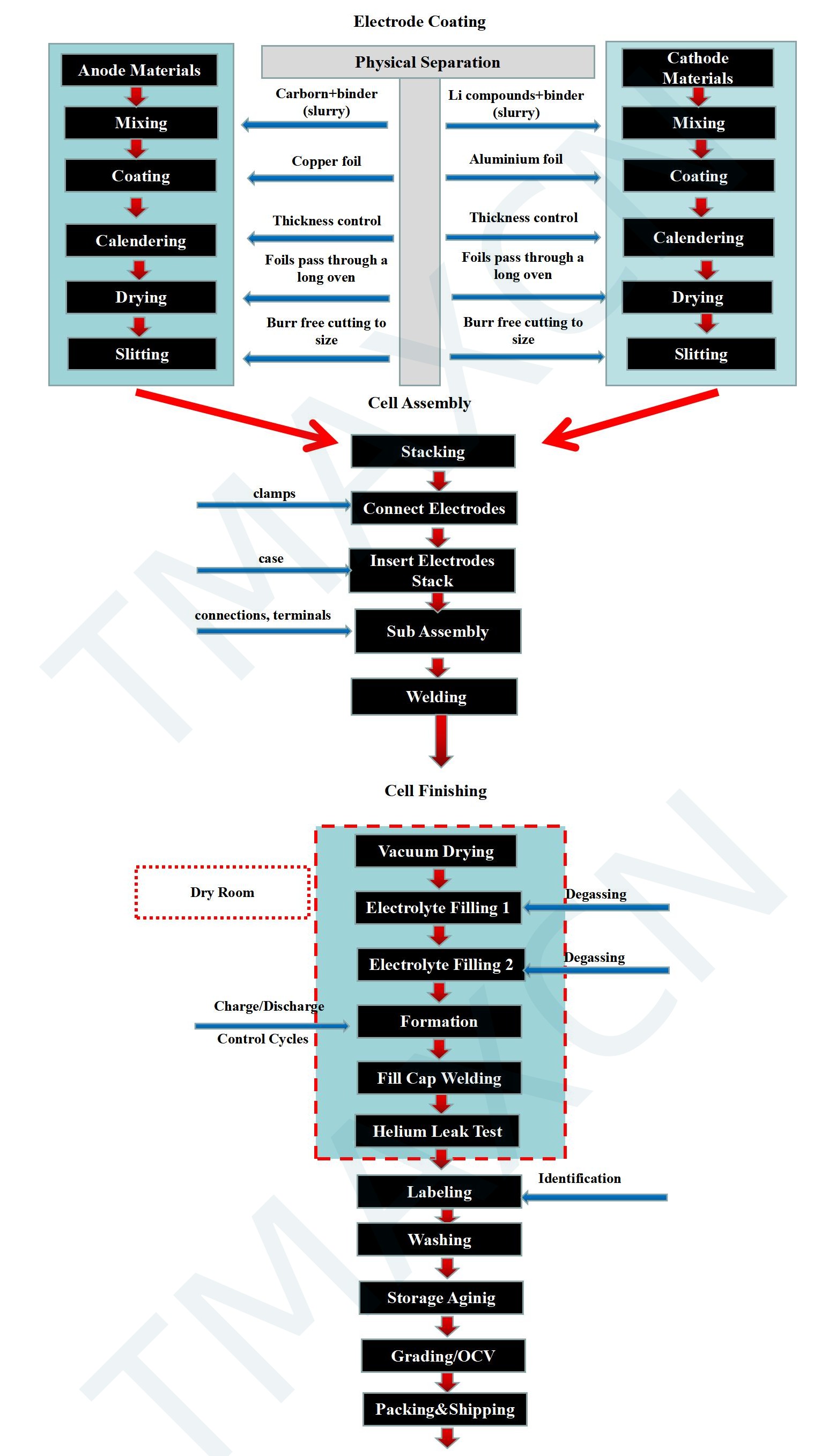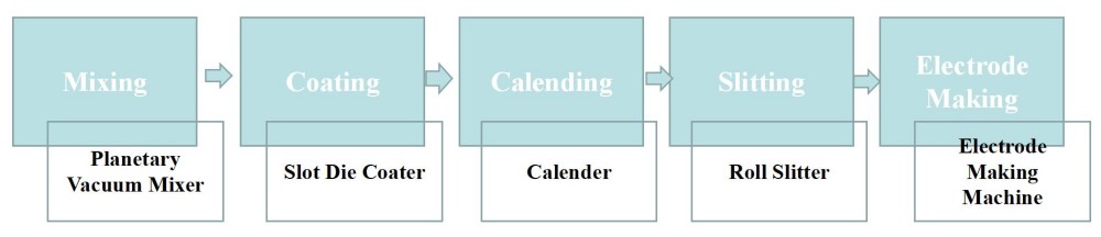 La primera etapa en la fabricación de baterías consiste en la fabricación de electrodos positivos y negativos. Los principales procesos involucrados son: mezcla, recubrimiento, calandrado, corte longitudinal y fabricación de electrodos (incluyendo troquelado y soldadura de lengüetas). Los equipos utilizados en esta etapa son: mezcladora, máquina de recubrimiento, prensa de rodillos, máquina de corte longitudinal y máquina de fabricación de electrodos.