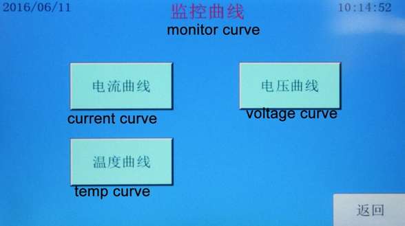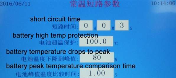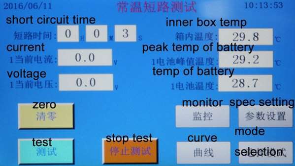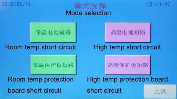 2. Modo de control: Control PLC. Utiliza un contactor de CA Schneider como componente de conmutación. Define las condiciones de prueba en la interfaz del PLC. El contactor absorbe y envía una fuerte corriente de cortocircuito para cortocircuitar todo el circuito y alcanzar la corriente de prueba requerida. La resistencia de bucle en el proceso del equipo ( es decir, resistencia del contactor + terminal de conexión + resistencia total de la fijación de la batería : 80 ± 20 mΩ). La corriente máxima de cortocircuito del contactor es de 1000 A. La corriente máxima de cortocircuito que soporta el circuito de prueba es de 1000 A. El elemento de adquisición detecta la temperatura superficial de la batería y los datos de cambio de tensión y corriente durante la prueba, y los envía al programa de control principal del PLC.