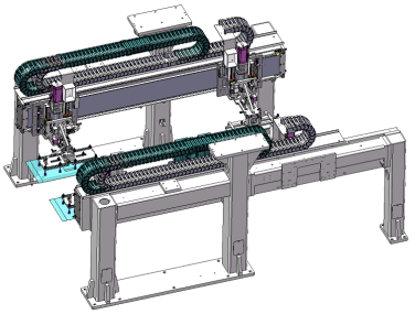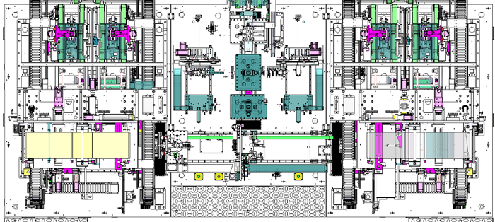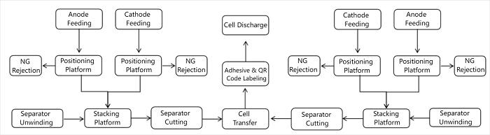 1.1 Descripción del funcionamiento. Esta apiladora de doble estación se utiliza principalmente para el proceso de apilado en Z de celdas prismáticas . Apila láminas de cátodo, láminas de ánodo y separadores en una celda mediante el proceso de apilado en Z, aplicando cinta adhesiva lateralmente, etiquetando con código QR y descargando la celda al siguiente proceso. El equipo consta de los siguientes componentes: mecanismo de alimentación de cajas de material, mecanismo de alineación de cátodo/ánodo, robot de transferencia de láminas de electrodos, unidad de desenrollado de separadores, unidad de mesa de apilado, mecanismo de corte en caliente de separadores, unidad de transferencia de celdas, unidad de aplicación de cinta adhesiva, unidad de etiquetado con código QR y mecanismo de descarga de celdas . Se utiliza para la producción totalmente automatizada de celdas tipo bolsa y prismáticas .