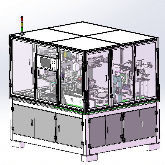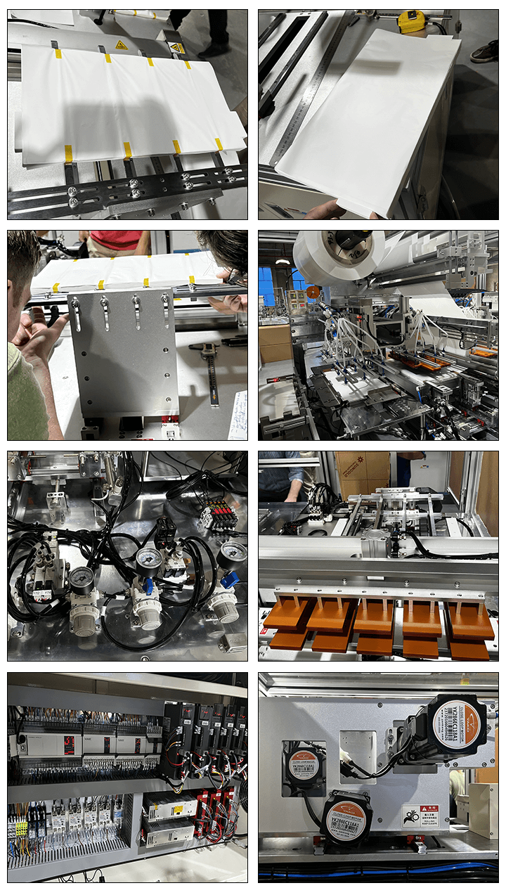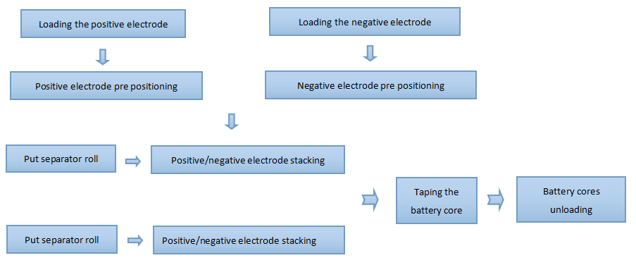 El separador toma la iniciativa de desenrollarse y es conducido a la mesa de apilamiento a través del mecanismo de tensión; la mesa de apilamiento impulsa al separador para moverse hacia adelante y hacia atrás para colocar los electrodos; los electrodos positivo y negativo se extraen de las dos cajas de material de la izquierda mediante dos juegos de ventosas del manipulador respectivamente, y luego se apilan en la mesa de apilamiento después de un posicionamiento preciso; después del apilamiento, el manipulador transfiere el núcleo de la batería a la estación de encolado del rollo de cola, y el rollo de cola es automático; el separador se corta y se golpea automáticamente.