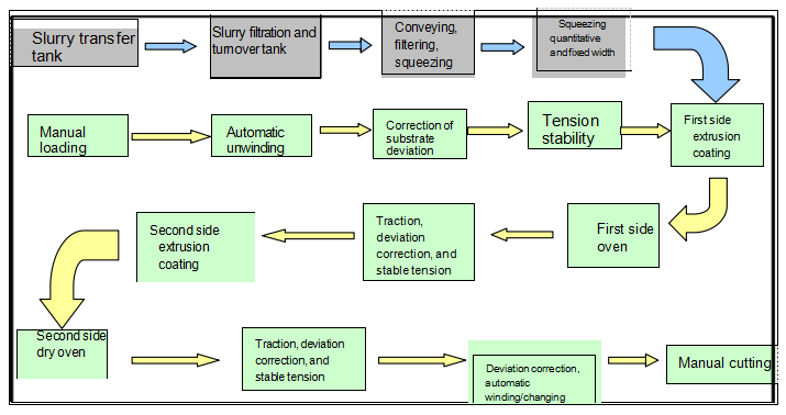 La máquina de recubrimiento de la serie HJSC1000ZZ es un nuevo tipo de máquina de recubrimiento por extrusión de doble capa, de alta precisión, confiable y estable, que nuestra empresa necesita desarrollar para baterías de litio. El equipo se caracteriza por: cabezal de extrusión de alta precisión, sensor de desplazamiento de alta precisión y control servo de bucle cerrado para el cabezal, bomba de tornillo de alta precisión, que transporta el medio con precisión y cantidad; horno con calentamiento eléctrico/vapor, rodillo activo y suspensión neumática superior e inferior; sistema de control PLC Omron, que permite un control preciso según los requisitos del proceso; control digital de tensión polar, desenrollado a tensión constante, recubrimiento a tensión constante, secado y bobinado a tensión cónica; control centralizado de los parámetros del sistema, con interfaz hombre-máquina táctil y control jerárquico. Los parámetros del proceso se pueden bloquear, almacenar y recuperar.