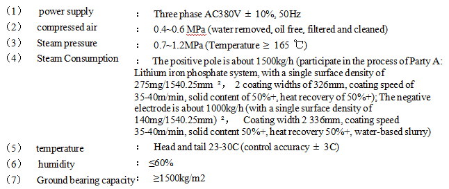 Volumen de aire de escape | Según el sistema LFP, con una densidad de superficie única de 200 g/ m² , un ancho de recubrimiento máximo de 800 mm, una velocidad de recubrimiento máxima de 40 m/min y un contenido de sólidos superior al 55 %, el volumen de aire de escape de la máquina de electrodo positivo es de aproximadamente 60 000 a 70 000 m³/h (a una temperatura de trabajo de 130 °C); si el electrodo negativo tiene una densidad de superficie única de 100 g/ m² , un ancho de recubrimiento máximo de 800 mm, una velocidad de recubrimiento máxima de 40 m/min y un contenido de sólidos superior al 50 %, el volumen de aire de escape de todo el electrodo negativo del sistema de agua es de aproximadamente 40 000 a 50 000 m³/h (a una temperatura de trabajo de 110 °C). |