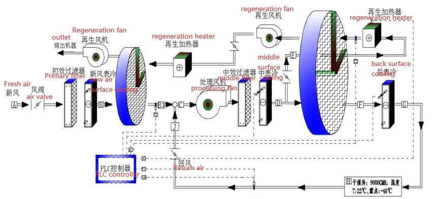 Nota: La unidad de deshumidificación del corredor se compone de: sección de filtro primario, sección de enfriamiento de la etapa frontal, sección de deshumidificación del corredor, sección de enfriamiento trasero, sección del soplador, sistema de regeneración, sistema de control y sistema de refrigeración.