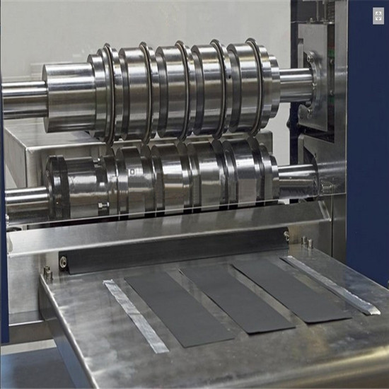 La máquina cortadora puede cortar electrodos con un ancho de hasta 400 mm y con un ancho de corte terminado de 20 mm a 400 mm con diferentes modelos de cuchillas de corte.
