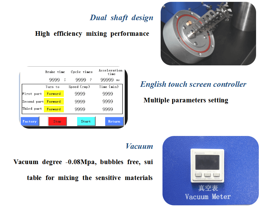 · Opera en un entorno de vacío , eliminando eficazmente las burbujas de aire generadas durante la mezcla; equipado con un sistema de vacío incorporado.