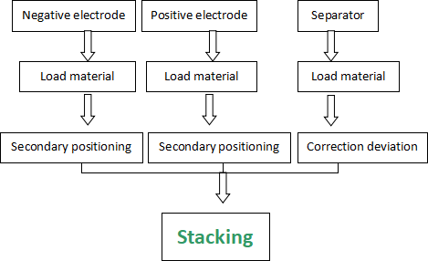 Los mecanismos manipuladores izquierdo y derecho del equipo recogen las placas de electrodos en las ranuras de material positivo y negativo, y después de un posicionamiento preciso por el banco de trabajo de posicionamiento secundario, se lleva a cabo la colocación alternada del material en la plataforma de apilamiento; La plataforma de apilamiento se mueve de izquierda a derecha junto con los dos manipuladores y forma una película de aislamiento en forma de Z para separar las placas de electrodos positivos y negativos; El dispositivo circula de esta manera para lograr el conjunto de apilamiento del grupo de electrodos .