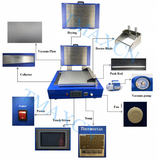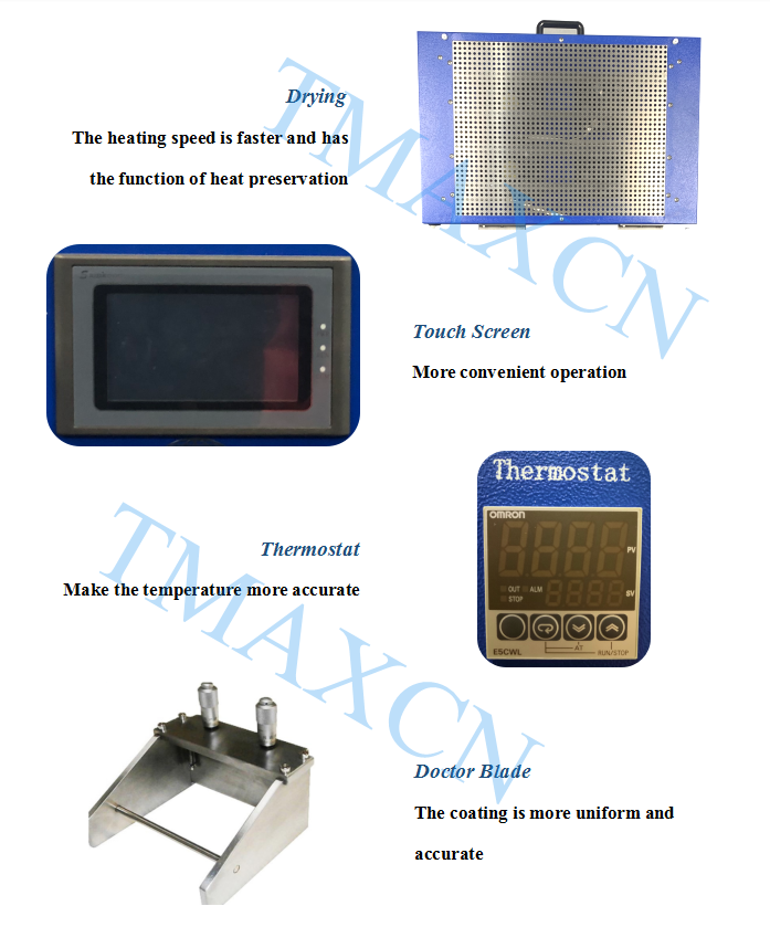 Procedimientos operativos | 1. Coloque el electrodo en la placa de vacío, inicie la fuente de alimentación, abra el vacío, la adsorción del electrodo en la placa de vacío. 2. Coloque el aplicador de película sobre el electrodo y agregue la suspensión de recubrimiento. 3. Abra la película, el dispositivo de película empuja automáticamente el aplicador de película para moverlo, película automática. 4. Retire el aplicador de película y la varilla de empuje, cúbralos con la tapa calefactora, configure la temperatura y el tiempo de calentamiento y caliente y seque. 5. Después del secado, abra la cubierta de calor, saque el electrodo de película recubierto y el dispositivo de película se reiniciará por completo. | |||||