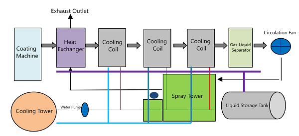 Este sistema se utiliza para recuperar N-metil-2-pirrolidona (NMP) de los gases de escape emitidos por las recubridoras de baterías de iones de litio. Con un bajo consumo energético, enfría el gas mediante agua circulante y desempaña el escape antes de su liberación. La concentración final de emisiones está muy por debajo de las normas nacionales, lo que garantiza el cumplimiento de las normas ambientales, el ahorro energético y la reutilización de materiales.