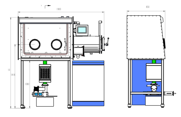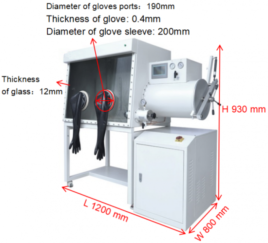 Guantera Caja | Material de la caja: acero inoxidable 304 (tipo 304), espesor 3 mm. Tamaño de la caja (excluida la antecámara y el soporte): 1220 mm (largo) x 750 mm (ancho) x 900 mm (alto). 47,2" x 29,5" x 35,4". Altura del soporte de la caja: 900 mm (35,43"). | |||||