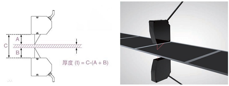 Las dos sondas se instalan en el mismo eje y se utiliza el método de geometría triangular para medir el espesor geométrico del material midiendo la distancia desde las superficies superior e inferior del material hasta el láser.