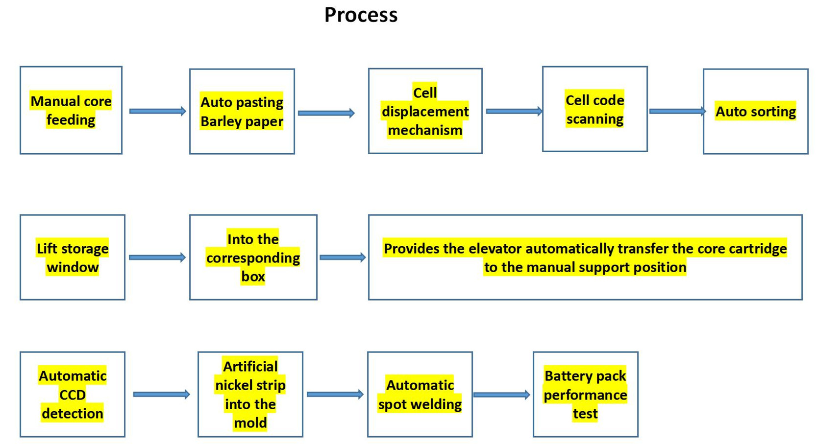 Con la amplia aplicación de las baterías de litio en el sector de las nuevas energías, los equipos de automatización se han convertido en uno de los pilares de la competitividad de la empresa. Tmax ha desarrollado de forma independiente el sistema de línea de ensamblaje automático de baterías de litio, que integra una máquina de pegado, una clasificadora, un sistema de prueba, un sistema de ensamblaje automático de baterías, un sistema de reconocimiento visual CCD y un sistema de soldadura por puntos automático. Además, selecciona una estructura de alimentación y clasificación totalmente automática para garantizar la consistencia de las celdas. Escanea y obtiene automáticamente el código de barras de la celda, lo clasifica, lo encuaderna y lo registra, y rastrea completamente la información de datos de la producción y fabricación del producto en combinación con el sistema MES.