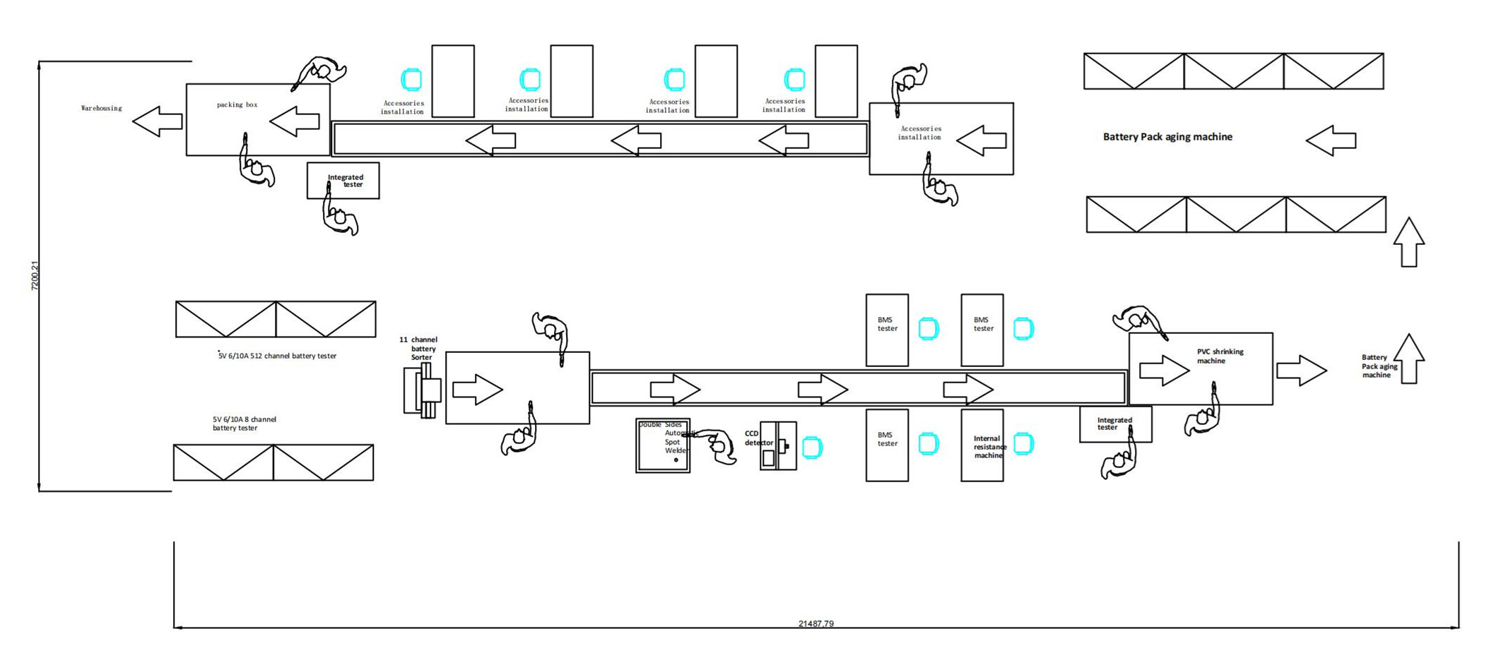 | Línea de montaje de la capa superior: L1500MM Ancho de correa 400MM, velocidad de transmisión de 1-3 m/min Potencia de transmisión: motor de desaceleración de 25 W, correa de PVC verde de 2 mm Función principal: conectar automáticamente la caja de goma vacía a la ascensor Cadena de montaje de clase baja: L5000MM Ancho de correa 400MM, velocidad de transmisión de 1-5 m/min Potencia de transmisión: motor de desaceleración de 180 W, correa de PVC verde de 2 mm Función principal: Transferencia de artículos en el back-end |