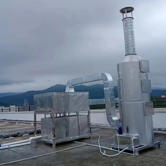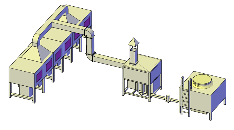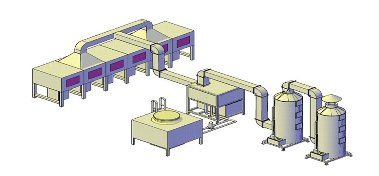 Salida de escape de la máquina de recubrimiento → Reciclaje de preenfriamiento → Torre de absorción 1 → Torre de absorción 2 → Tubo principal de escape de gases de escape