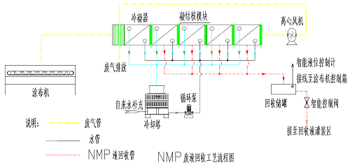 El sistema de recuperación de NMP aprovecha las características físicas del NMP y utiliza un sistema de condensación multietapa para condensarlo completamente y lograr su recuperación. La temperatura del gas residual descargado por la recubridora es de aproximadamente 120 °C. Esta temperatura se puede reducir a aproximadamente 25 °C mediante el sistema de recuperación, que puede enfriar y recuperar más del 95 % del NMP.