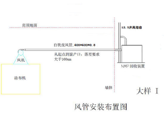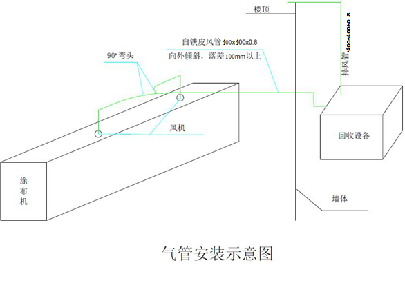 El conducto de aire del equipo de recuperación adopta un tubo de cuero de hierro blanco con un tamaño de : 300 mm x 30 0 mm x 0,6 mm ( espesor ). La conexión entre la sección de la tubería y la sección de la tubería está sellada con gel de sílice de alta temperatura .