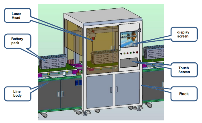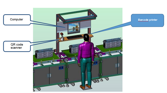 Esta estación de trabajo se opera manualmente, principalmente para escanear y cargar secuencialmente las celdas de batería compuestas por módulos Pack, y generar el código de barras del módulo Pack. Simultáneamente, la impresora de etiquetas imprime el código de barras del módulo Pack, y la etiqueta se adhiere manualmente.