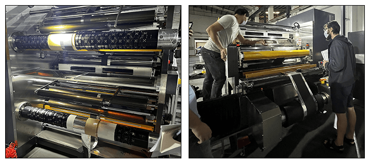 Utilizando un carro de transferencia, cargue el material en el eje de desbobinado → mesa de empalme → rodillos de tracción → grupo de cuchillas de corte → grupo de rodillos → ejes diferenciales superior e inferior → rebobinado de recorte → configure la tensión requerida → cambie la guía de banda al modo automático → presione inicio → la máquina corta y rebobina automáticamente.