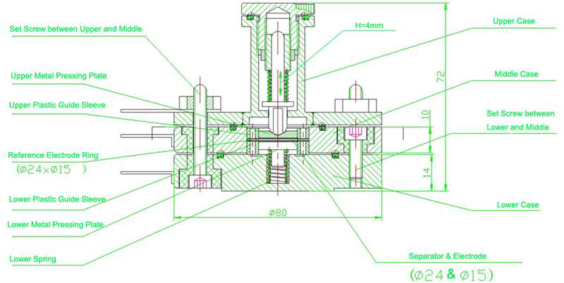 2. Está diseñado para probar varios electrodos de manera fácil y rápida, brindándole al usuario una estructura para simular celdas de moneda ensambladas sin la necesidad de engarzar carcasas de celdas de moneda reales.